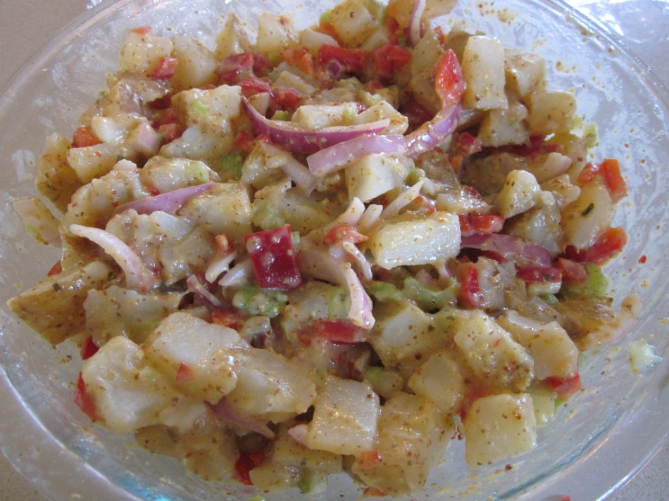 Boil potatoes until tender. Drain and cut in cubes. Add potatoes, celery and green onions to bowl with dressing. Mix well. Refrigerate.